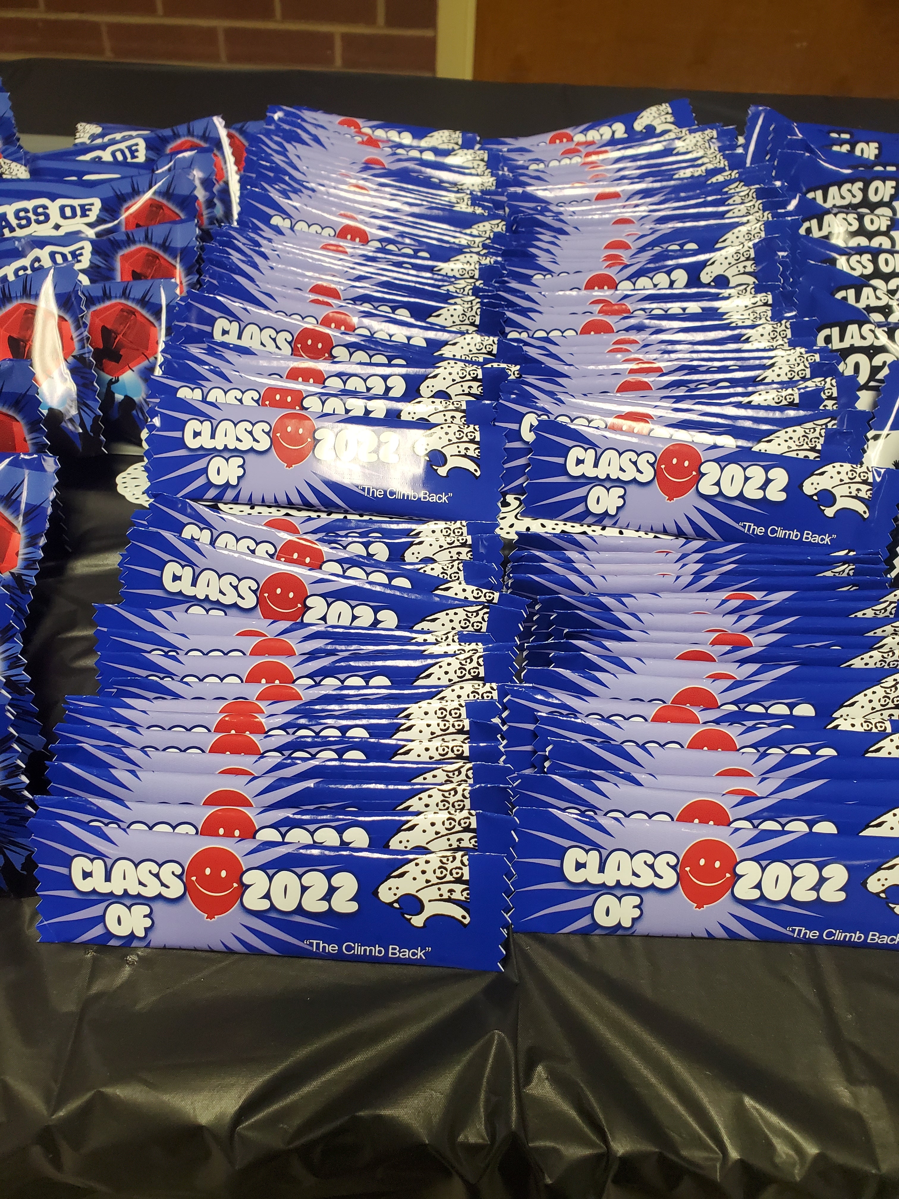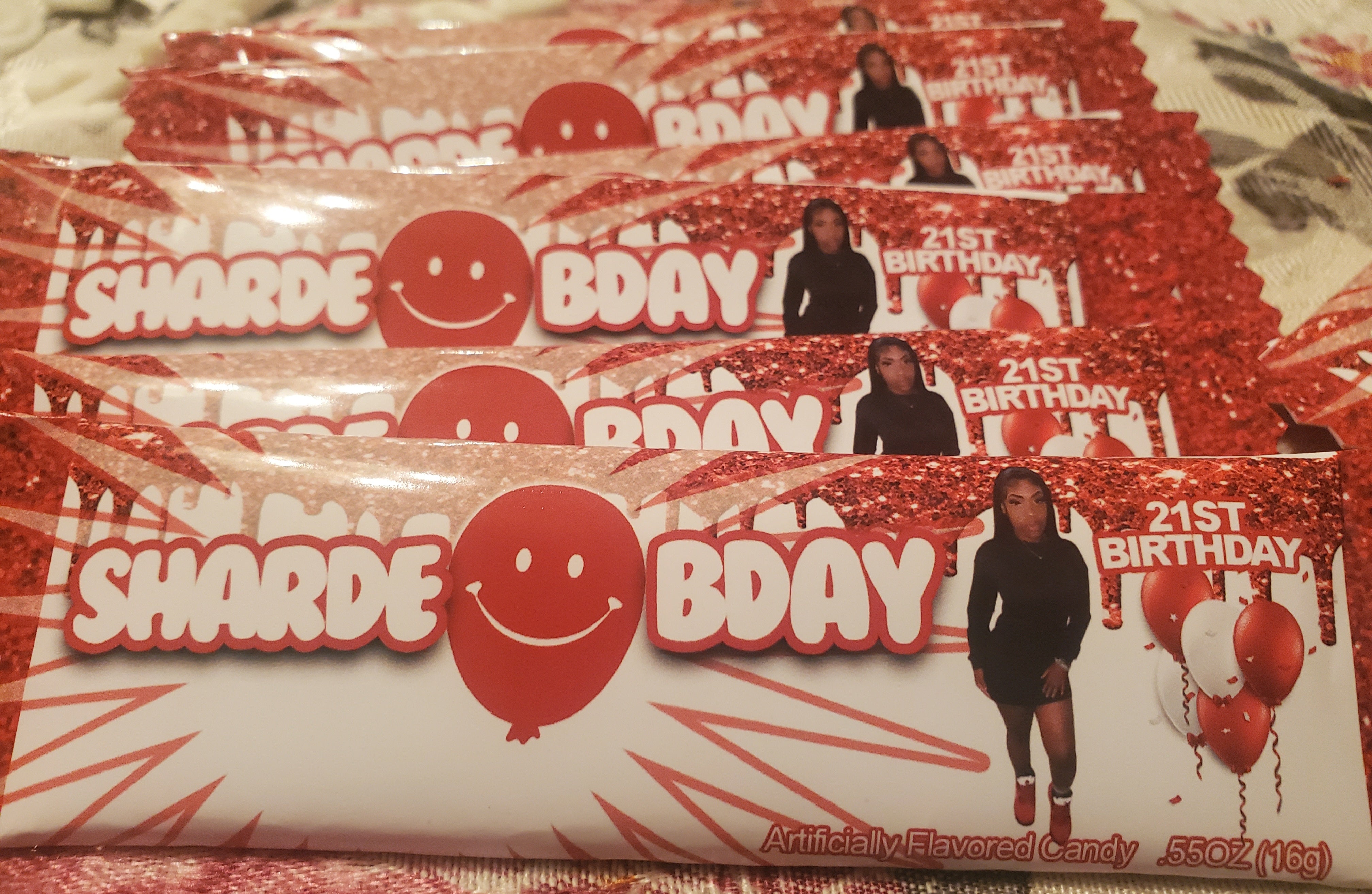 Your favorite taffy candy bar wrapped in a themed design wrapper of your choice. These will come in a variety of flavors. Party Favors comes by the dozen.